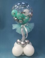 1 Bubble balloon filled with 4 aqua blue balloons, 4 silver balloons, 4 white balloons