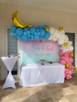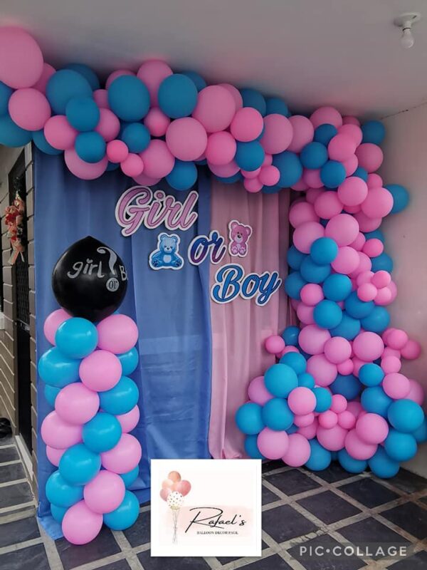 Organic balloon arch of 150 balloons pastel pink, latex white & latex blue