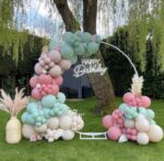 200 Balloons arch of vintage green balloons, vintage brown balloons, vintage aqua blue & vintage pink balloons